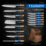 Complete 15-Piece Damascus Steel Knife Block Set which includes our bestselling 7-Piece Tsunami Damascus Chef Knife Collection, 6 matching Tsunami Damascus Steak Knives, Acacia Hardwood Knife Block, and a matching Tsunami Sharpening Steel.