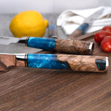 Each knife has a stunning Blue Resin Burl Wood Handle that not only adds a beautiful accent to your kitchen, but also confers a strong, comfortable grip to make your chopping as effortless as possible. Each handle has a one-of-a-kind design; no two handles will be the same.