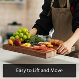 The cutting board is easy to hold and move with built-in handles on each side, making it also function as a charcuterie board or serving tray.
