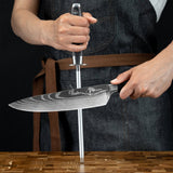 The rod is designed to make your knife sharpening experience as effortless and enjoyable as possible. The sharpener is extremely sturdy and will not move while sharpening. The handle is finished Pakka wood that is smooth to touch and confers a strong yet comfortable grip.