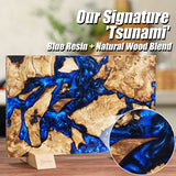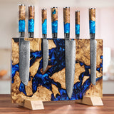 Each block is uniquely crafted with a one-of-a-kind dark blue resin burl wood blend that resembles the beautiful aesthetic of the bestselling Tsunami Damascus Knife Collection.
