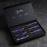 Each knife is ergonomically designed with a comfortable purple resin handle, along with a Finger Guard for extra protection.