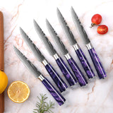 The Amethyst Steak Knives are forged from premium High-Carbon Steel and are carefully heat-treated and sharpened to perfection for razor-sharp cutting and extreme durability. Each knife is also engraved with a beautiful Damascus pattern, paying homage to a style of knife-making whose history stretches back over 1000 years.