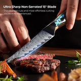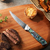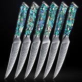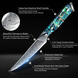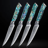 I bought a set of four of these knives as a gift for my husband. Even though I'm a vegetarian, I had to include a review about them. The design is just so beautiful and the quality is amazing. The knife handles are serrated and have an abalone shell handle. The damascus steel is so sharp and the knife literally cuts through my vegetables with ease. I would definitely buy these knives for myself.