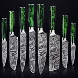 Each knife has stunning Green Resin Handle that not only adds a unique accent to your kitchen, but also confers a strong, comfortable grip to make your chopping as effortless as possible. The knives also have a finger guard for extra protection.