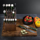 Complete 16-Piece Knife Block Set which includes our bestselling 8-Piece Wasabi Knife Collection, 6 matching Wasabi Steak Knives, Acacia Hardwood Knife Block, and a pair of Kitchen Shears.