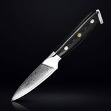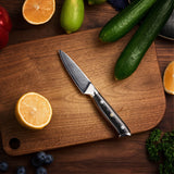 The pinnacle of knife-making, the Shogun 3.5" Damascus Steel Paring Knife is individually forged from 67-layer Japanese Damascus Steel with a HRC Rating of 62 for unparalleled hardiness and performance.