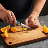 The Tsunami Paring Knife is an individually forged Damascus knife made of 67-layer Japanese Damascus Steel with a HRC Rating of 62 for unparalleled hardiness and performance.