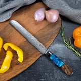 The Tsunami Bread Knife has a stunning Blue Resin & Natural Wood Handle created through a unique crafting process, so the beauty of each handle is unique and different.