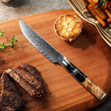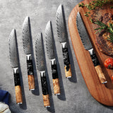 The Black Tsunami Damascus Steak Knives are individually forged from 67-layer Japanese VG10 Damascus Steel for unparalleled hardiness and durability, and have a beautiful, natural Damascus wave pattern.