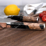 Each Black Tsunami Steak Knife has a one-of-a-kind black resin burl wood handle created through a unique crafting process, so the beauty of each handle is unique and different.
