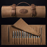 Heavy-Duty Leather + Oil-Waxed Canvas Chef Knife Roll Bag with 12 primary slots for your knives and tools, as well as an 2 additional zipper pouches on the sides, allowing you to carry all of your chefs knives and tools with you anywhere you go.