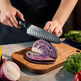 The Shogun Santoku Knife has seamless welding from blade to handle. The handle itself is a G10 Full Body handle that confers a firm yet comfortable grip to make your chopping as effortless as possible.