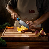The Tsunami Santoku Knife is an individually forged Damascus kitchen knife made of 67-layer Japanese Damascus Steel with a HRC Rating of 62 for unparalleled hardiness and performance.