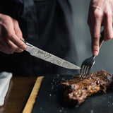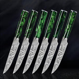 The 6-Piece Wasabi Steak Knife Set is forged from premium High-Carbon Steel and are carefully heat-treated and sharpened to perfection for razor-sharp cutting and extreme durability. Each knife is etched with a beautifully engraved pattern that will look absolutely stunning in your modern kitchen as well as on your dining table.