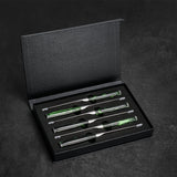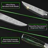 Each knife is ergonomically designed with a stunning Emerald Green Resin Handle as well as a Finger Guard for extra protection.